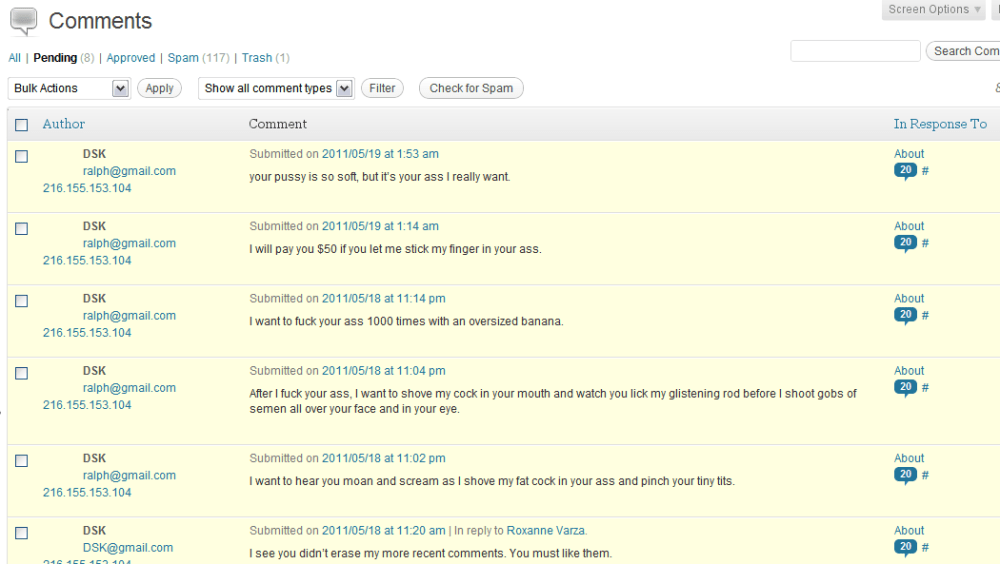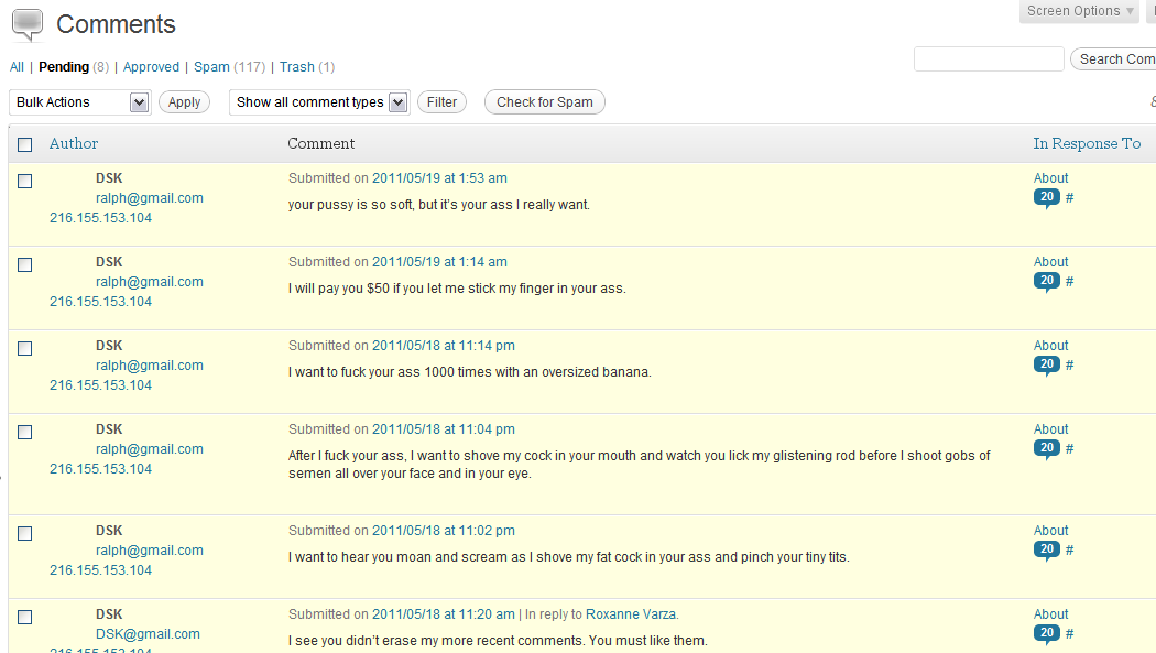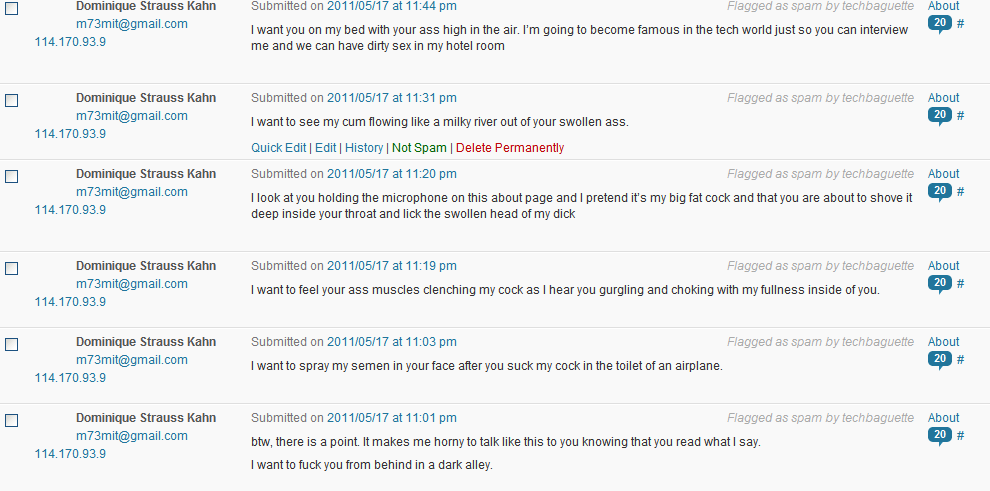 The point is that for whatever reason some jerk has been writing dozens of horribly inappropriate comments on my blog, using either “Dominique Strauss-Kahn” or “Michael Arrington” as his name. Most of you have probably already seen them, but if not here’s a sample of some of the comments I’ve received (nice job hacking and using this IP address and this one*)